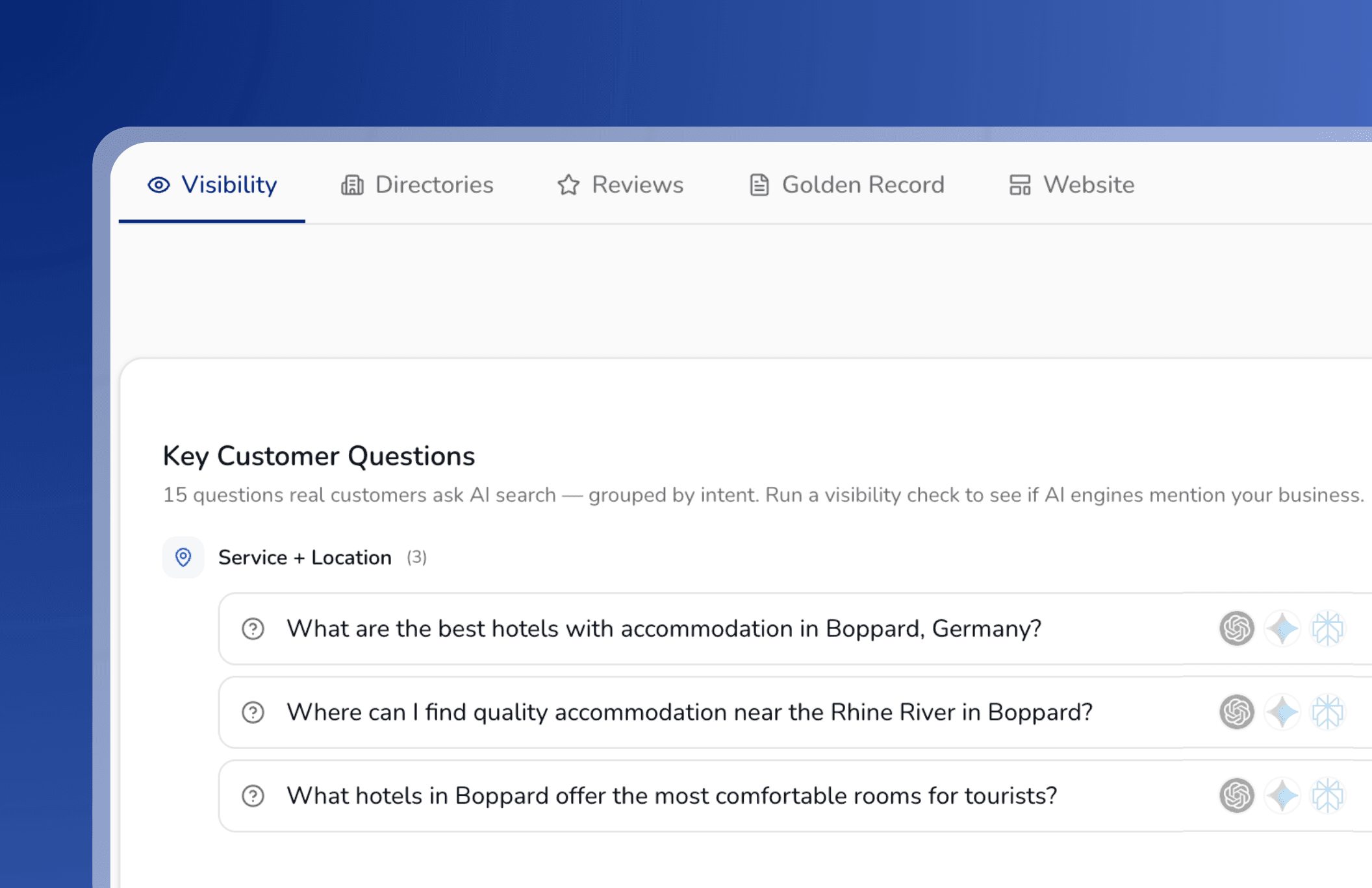 Every week, we test top AI engines what real customers ask about your business. We track if and how you show up.