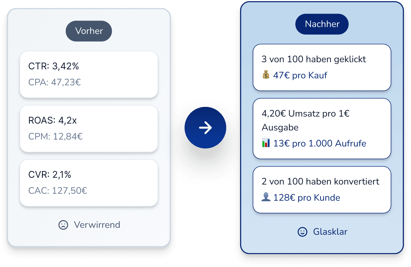 Adlarion übersetzt komplizierte Marketingbegriffe und Zahlen von all deinen Plattformen in einfache Sprache, die jeder auf einen Blick verstehen kann.